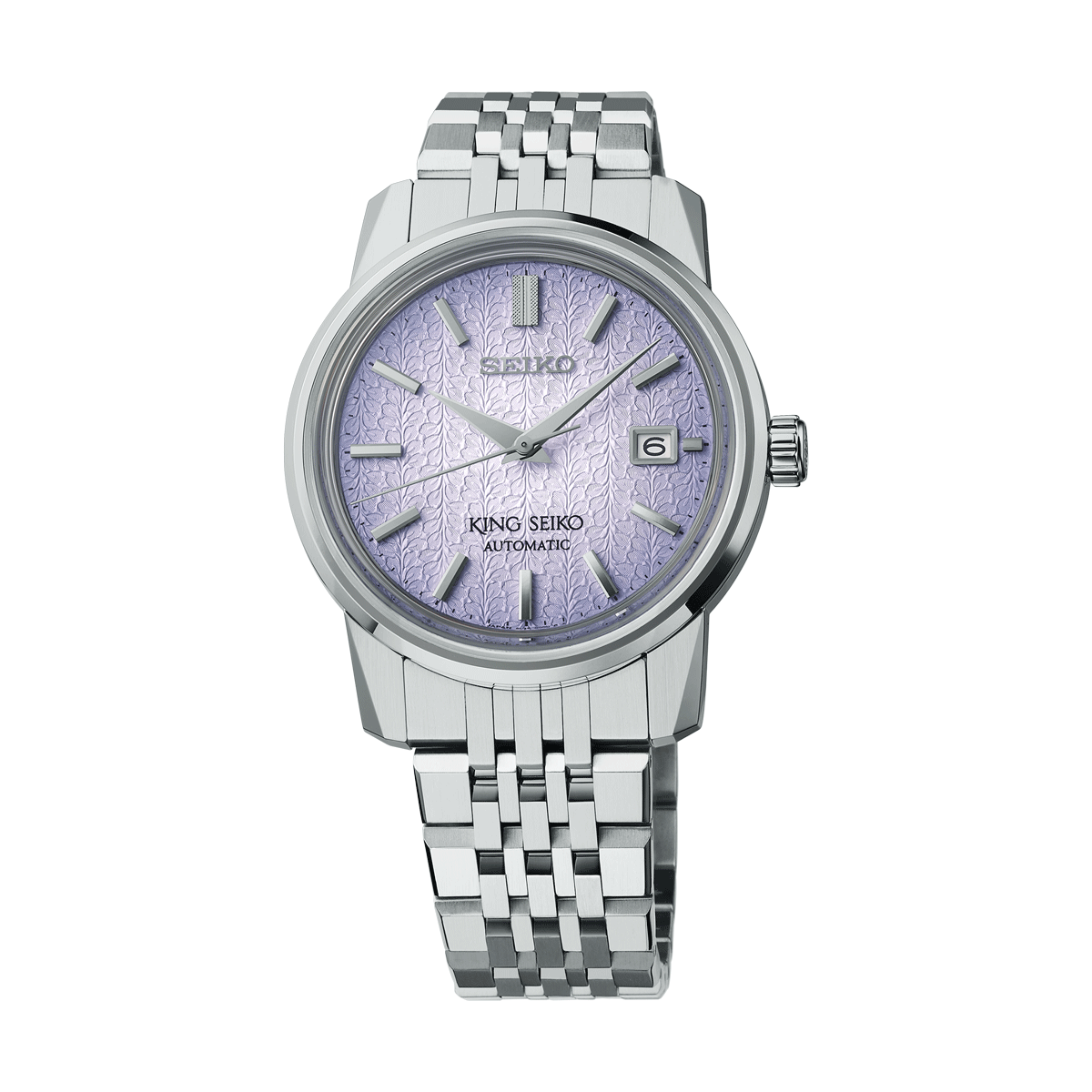 The Japanese concept of ‘Ukiyo-e’ is a form of Japanese artistry which began in the 17th century. The images are expressed in the form of woodblock prints or paintings of traditional cultural Japanese scenes – usually featuring Kabuki performers, Sumo wrestlers, historic scenes, folk tales, landscapes, or nature. The dial of this King Seiko timepiece is inspired by the nature found in Kameido, the where the King Seiko brand began, designed into the form of kiyo-e. The ‘Tenjin-Fuji Violet’ features a new wisteria flower pattern in a pale violet gradation. The unique lavender-coloured dial takes its inspiration from the Kameido Tenjin Shrine where wisteria were planted during the Edo period. These purple flowers hanging from the trellises in the Japanese garden are a visitor attraction during April and May. During the Fuji Festival, the wisteria are lit up at night, giving a purple glow to the area. Over hundreds of years these flowers have inspired artists from Hiroshige Utagawa’s “One Hundred Famous Views of Edo” painted in 1856-1859 to “Le Bassin aux nymphéas, harmonie rose” painted by Claude Monet in 1899. Under a box sapphire crystal glass are a set of sharp Dauphine-style hands with multifaceted edges. It has a sharp, angular brushed finish case design and an intricate seven-piece bracelet. Powered by the in-house 6L35 automatic calibre – Seiko’s slimmest automatic movement which is accurate to +15/-10 seconds per day, this piece has a power reserve of 45 hours. Long live the new King Seiko: modernised elite watchmaking, yet its stately, dignified and majestically classic looks remain.